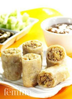 Letakkan 2 sdm adonan isi di dalam setiap lembar kulit lumpia, gulung bentuk lumpia sambil padatkan, rekatkan bagian pinggirnya dengan larutan terigu. Lakukan hingga selesai.